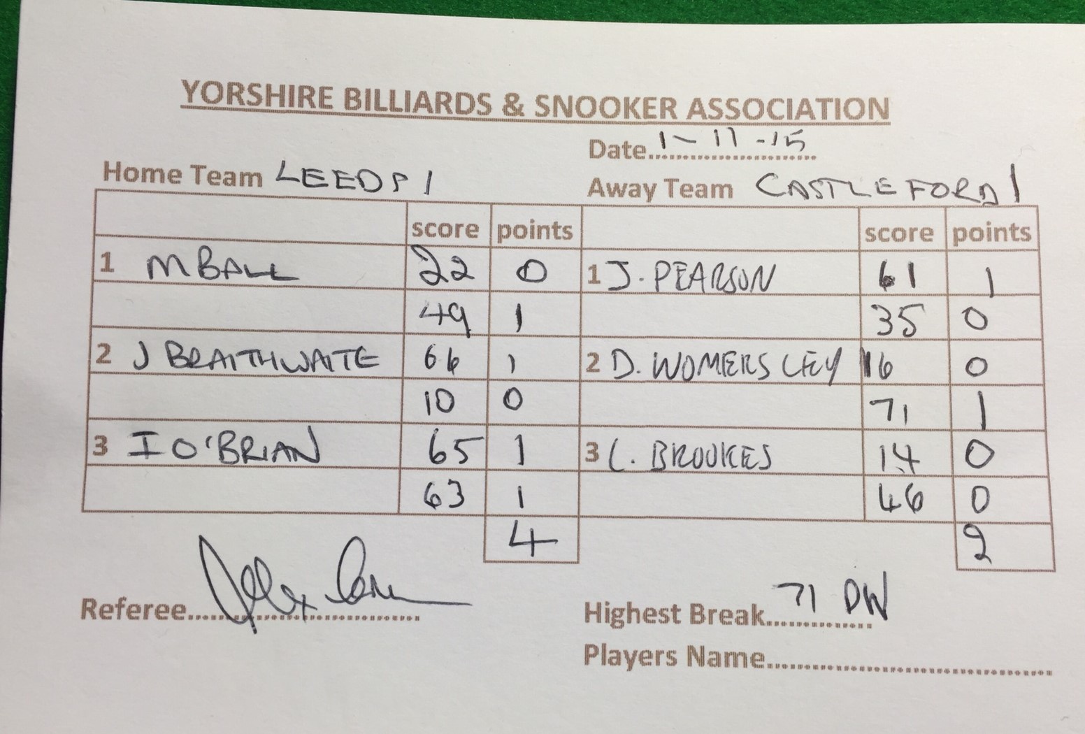 | October 25, 2015 | 19:30 | Yorkshire Snooker League – Division one (2015/16) | 2015/16 |