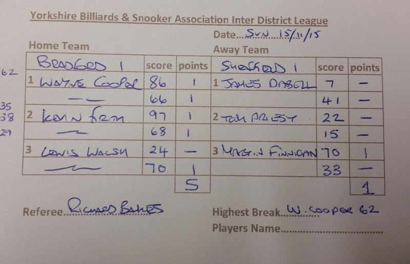 | November 15, 2015 | 19:30 | Yorkshire Snooker League – Division one (2015/16) | 2015/16 |