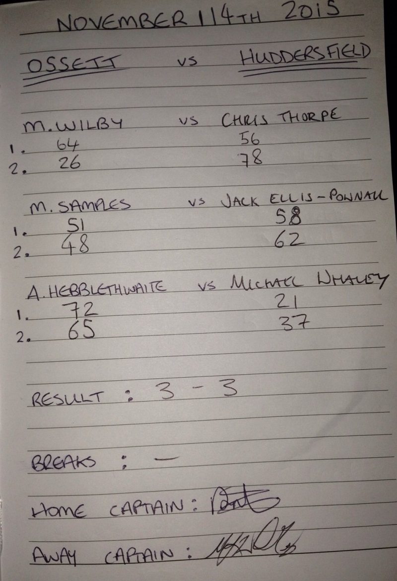 | November 15, 2015 | 19:30 | Yorkshire Snooker League – Division one (2015/16) | 2015/16 |