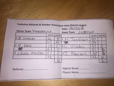 | January 24, 2016 | 19:30 | Yorkshire Snooker League – Division one (2015/16) | 2015/16 |