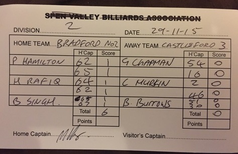 | November 29, 2015 | 19:30 | Yorkshire Snooker League – Division two (2015/16) | 2015/16 |