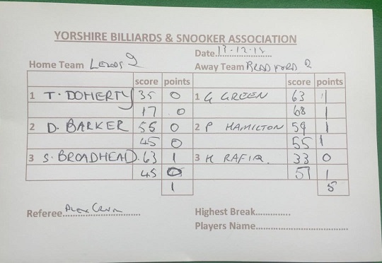 | December 13, 2015 | 19:30 | Yorkshire Snooker League – Division two (2015/16) | 2015/16 |