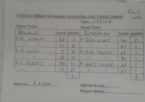 | January 13, 2018 | 19:30 | Yorkshire Snooker League – Division two (2017/18) | 2017/18 |