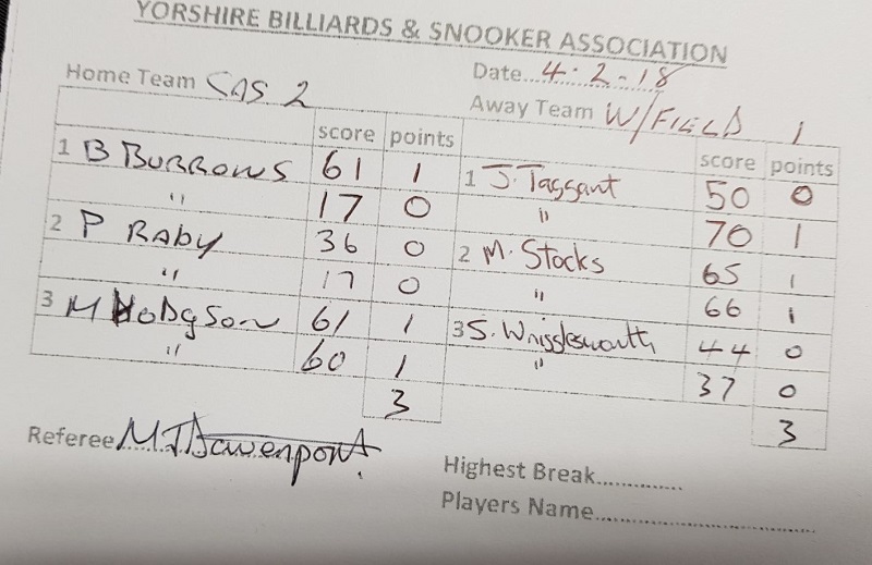 | February 3, 2018 | 19:30 | Yorkshire Snooker League – Division one (2017/18) | 2017/18 |