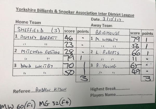| December 9, 2017 | 19:30 | Yorkshire Snooker League – Division two (2017/18) | 2017/18 |
