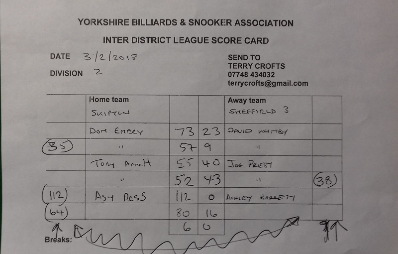 | February 3, 2018 | 19:30 | Yorkshire Snooker League – Division two (2017/18) | 2017/18 |
