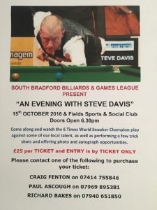 South Bradford Billiards and Snooker Games League presents a Snooker Extravaganza featuring the one and only interesting Steve Davis. 15th October at Fields & Sports social club Click the poster for all the info and how to purchase the limited tickets. If you have never seen Steve live then this is for you, 6 times …