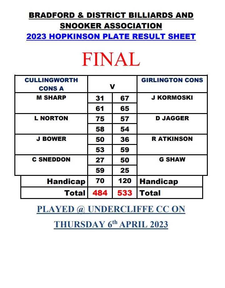 John Bower (Cullingworth) & ross Atkinson (Girlington) shared there 2 frames 50-36 & 53-59 & Chris Sneddon (Cullingworth) & Gary Shaw (Girlington) shared both their frames 27-50 & 59-25 to see Girlington Conservative run out worthy winners.